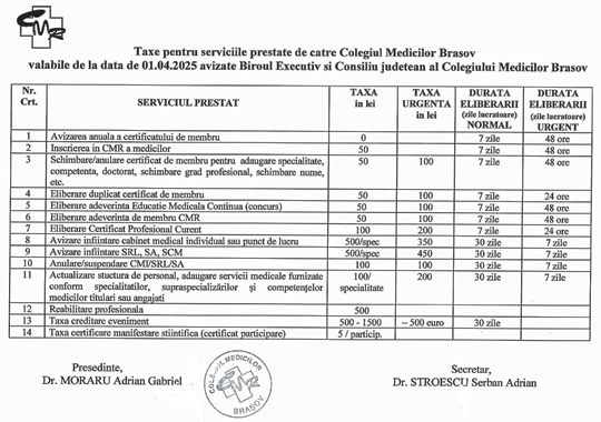 Taxe percepute de Colegiul Medicilor Brașov și termene de răspuns aici